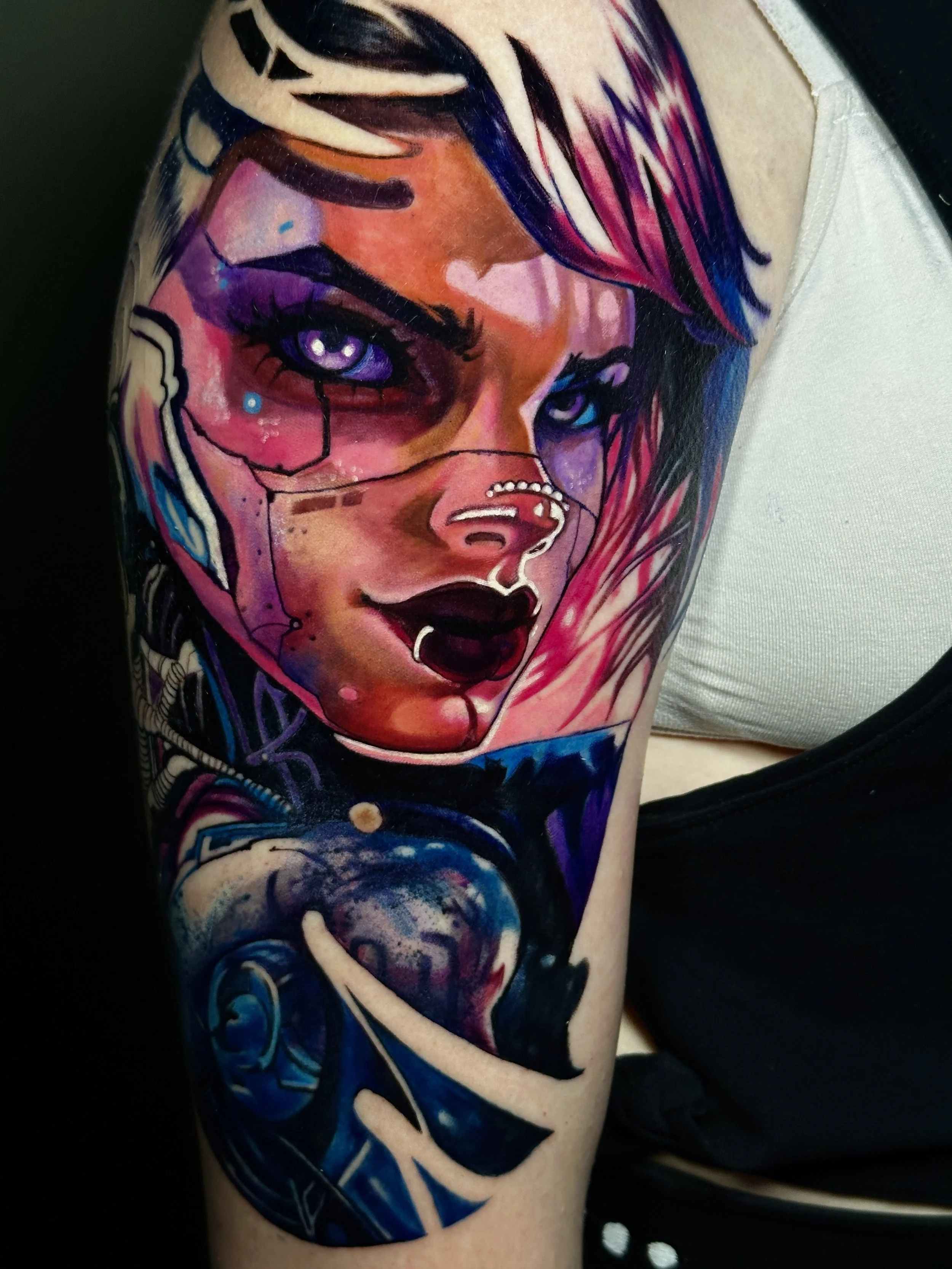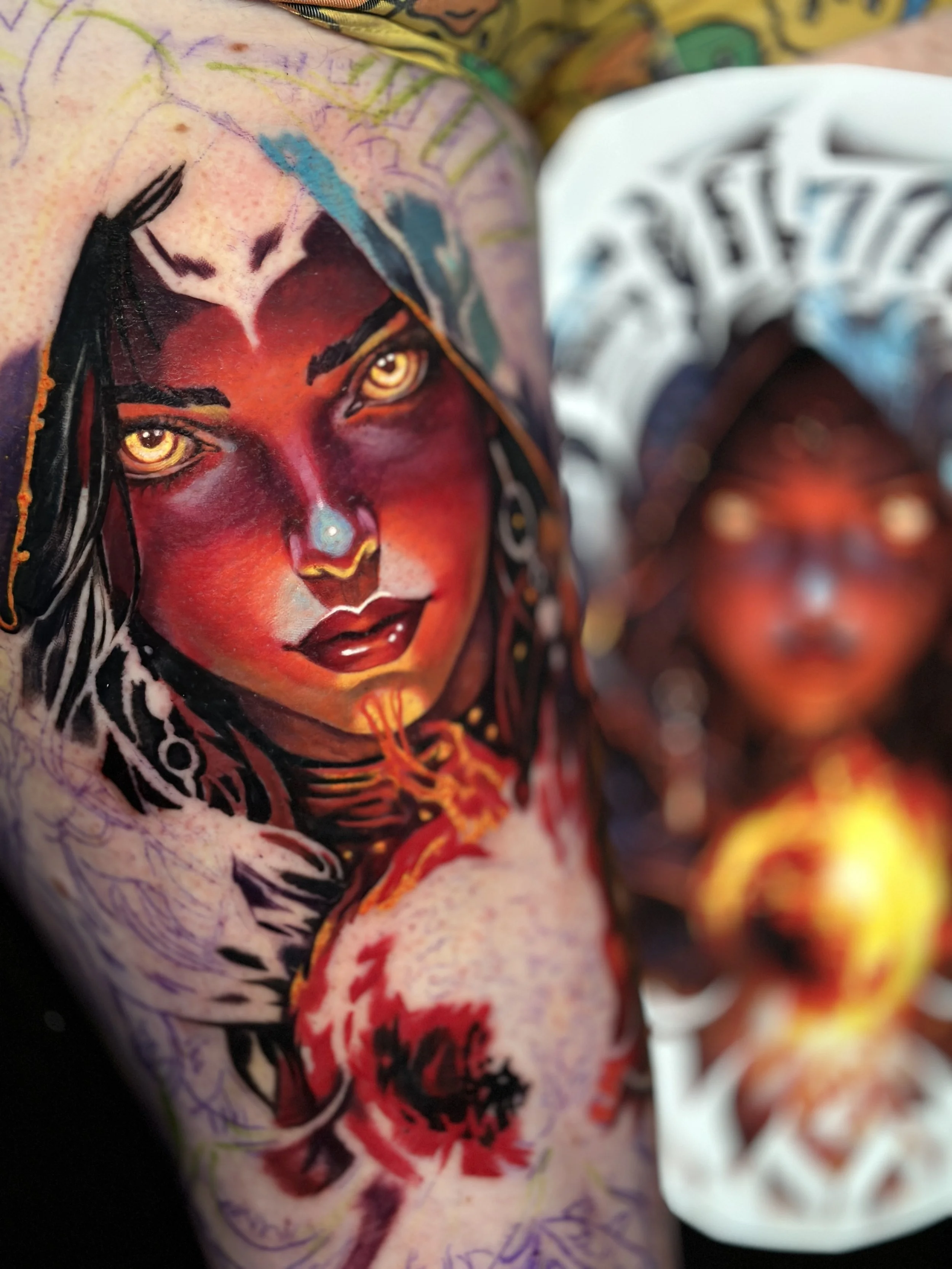 Colour portraits and illustrative tattoo work, defined by bold composition, strong colour, and freehand execution.